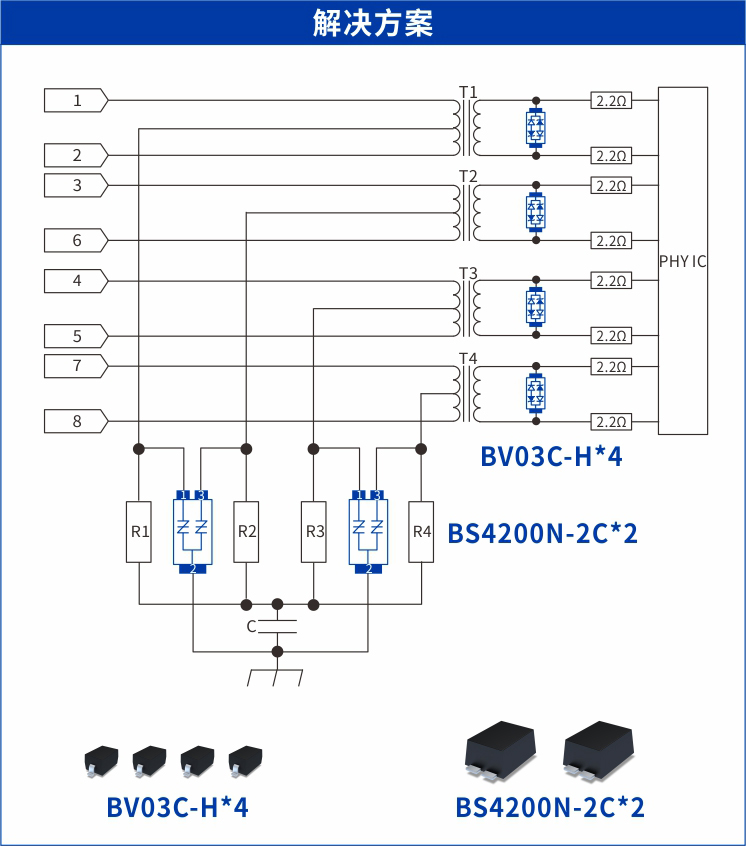 第二級防護(hù),為滿足千兆網(wǎng)口高速數(shù)據(jù)傳輸對防護(hù)器件性能參數(shù)設(shè)計要求,檳城電子推薦使用低容ESD器件BV03C-H,工作電壓 3.3V,結(jié)電容1.5pF,峰值脈沖電流25A,采用SOD323封裝,并符合IEC 6100-4-2 (ESD)±30kV (空氣放電) 和±30kV (接觸放電) 標(biāo)準(zhǔn)。該方案在75℃高溫環(huán)境下能保證數(shù)據(jù)傳輸無丟包,可吸收差模浪涌殘余能量,有效保護(hù)PHY,同時后級可以串接2.2Ω電阻作為退耦器件,阻礙浪涌或ESD電流往后級流動迫使BV03C-H快速充分地導(dǎo)通。